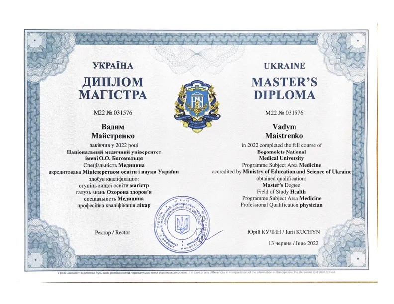 Закінчив у 2022 році Національний медичний університет імені О.О. Богомольця