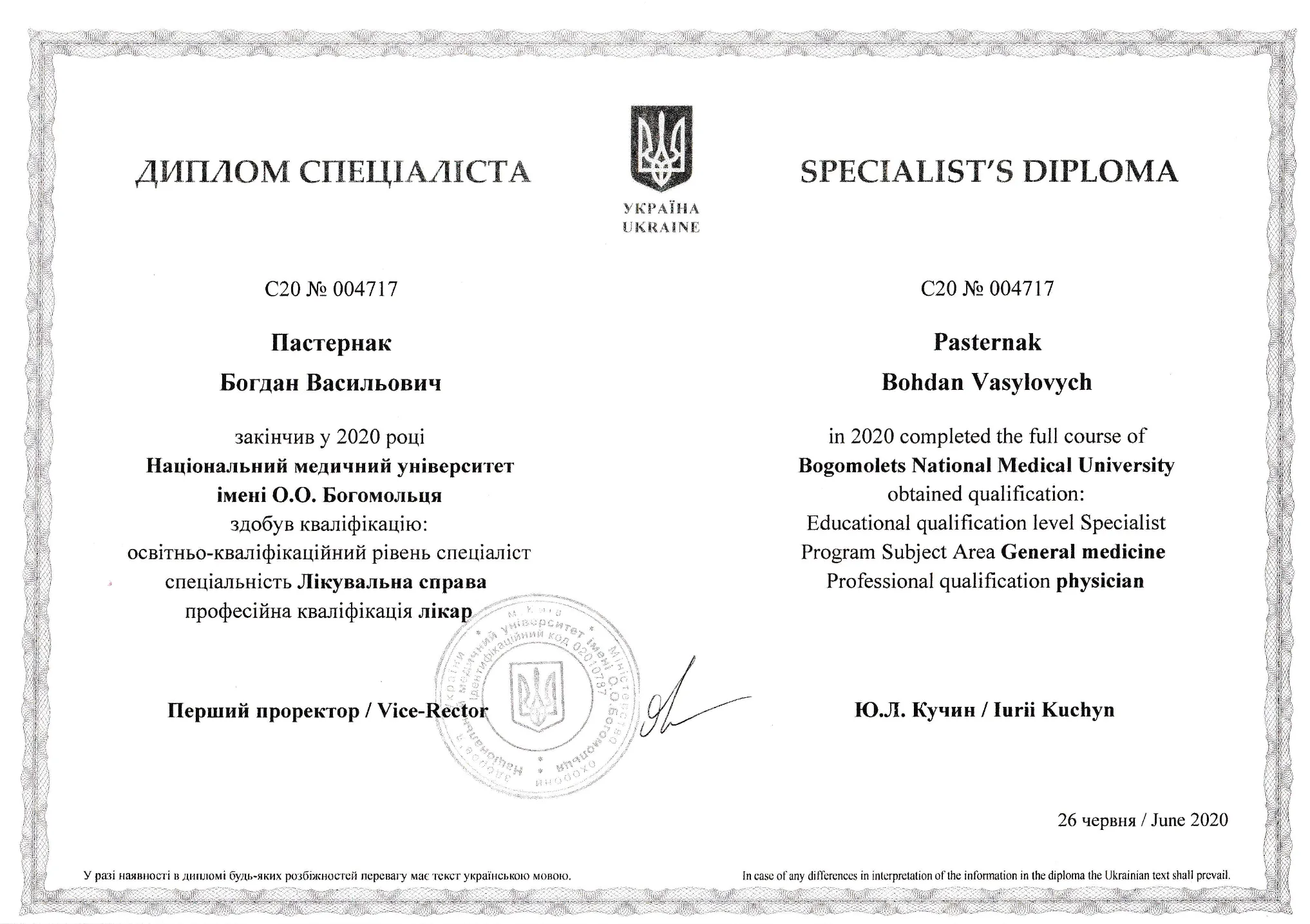Закінчив Національний медичний університет ім. О. О. Богомольця у 2020 році